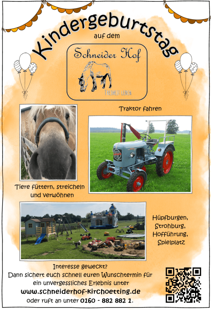 Ab August 2024 ist es möglich Kindergeburtstage am Schneider Hof zu feiern. Dafür bieten wir euch verschiedene Modelle an, um den Geburtstag eurer Kinder unvergesslich zu machen.